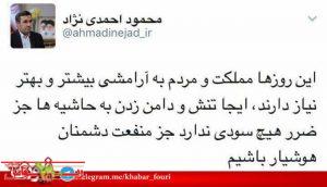 احمدینژاد در واکنش به رد صلاحیتش از سوی شورای نگهبان، واکنشی توییتری داشت؛ او در موضعی دوپهلو گفت که باید هوشیار باشیم چرا که حاشیهها، فقط برای دشمن، منفعت دارد.